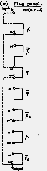 suffix is shown, that corresponding to the column is to be assumed). It will be seen that Psi, X2oneback, Mu, P5twoback have each an "in" jack and an "out" jack. Anything put into "in" appears at "out" with the appropriate impulse added to it. Chi has no in jack being normally connected to "IMP", which is in effect, "Z out". Xoneback PSIoneback have no out jacks being permanently connected to PSI X2 respectively. Chi and psi are normally connected both up and down (dotted lines) but a plug inserted in one of their jacks automatically breaks the normal connection to that Jack.